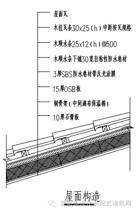 掛綠湖項目采用冷彎薄壁型鋼桁架+保溫棉+OSB板+防水構造+屋面瓦的做法。